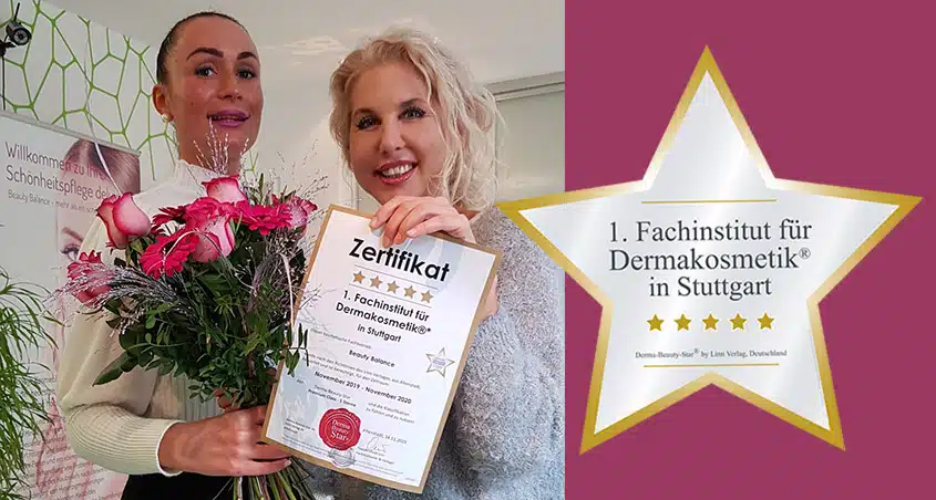 Als erstes Kosmetikstudio in Stuttgart darf sich Beauty Balance nun als „Fachinstitut für Dermakosmetik“ bezeichnen. Wir freuen uns sehr, dass wir nach einem ausführlichen Zertifizierungsverfahren den Derma Beauty Star erhalten haben!
