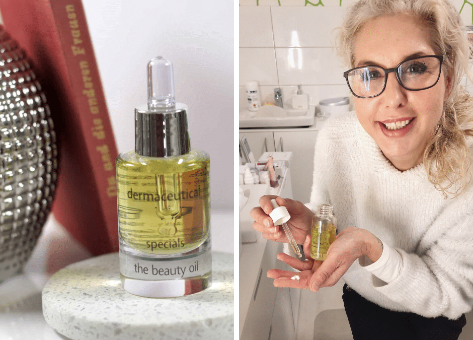 Bildcollage mit einem Bild des Beauty Oils und einem Bild. das Carola Kiesel mit dem Öl in der Hand zeigt